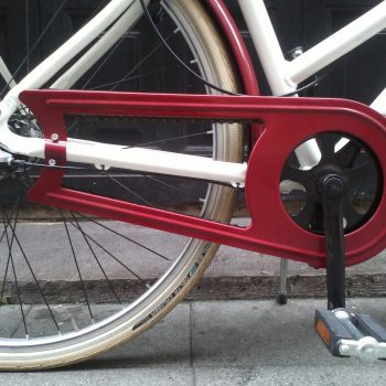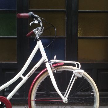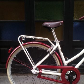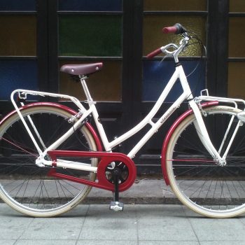 Bicicleta clásica con cuadro de aluminio, cómoda barra baja, tres velocidades de cambio interno Shimano Nexus 3, guardabarros y portabultos delantero y trasero, cepo holandés, cubiertas crema Schwalbe Delta Cruiser, Sillín Selle Royal Ondine granate, luces, pata de cabra… muy completita.